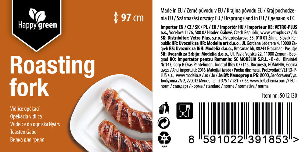 Widełki do opiekania z dwoma kolcami ze stali nierdzewnej są odpowiednie do opiekania kiełbasek, warzyw i innych potraw przygotowywanych nad ogniem lub w grillu. Widelec jest wyposażony w drewnianą rączkę do lepszego trzymania. Długość ogólna widelca z 97 cm.