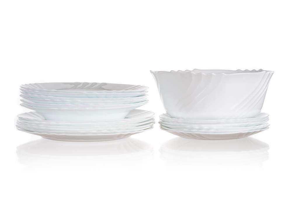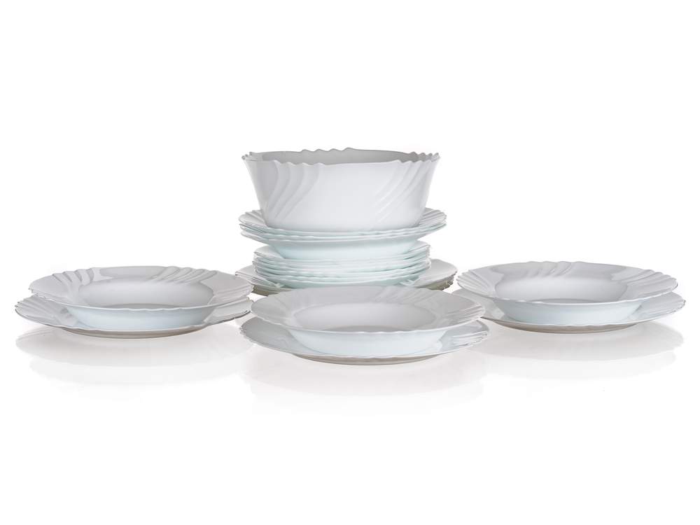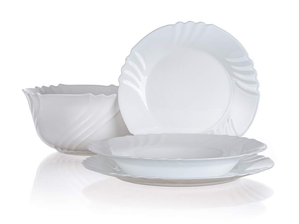 19 częściowy zestaw szklany EBRO zawiera: 6 x talerz deserowy o średnicy 20 cm, 6 x talerz płaski o średnicy 25,5 cm, 6 x talerz głęboki o średnicy 23,5 cm a 1 x misa o średnicy 23 cm. Wszystko jest wytrzymałe na szok termiczny, odpowiednie do zmywarki do naczyń oraz mikrofalówki.